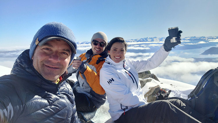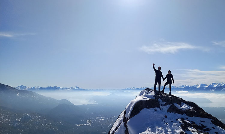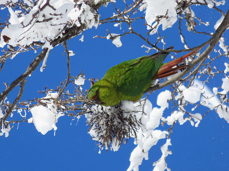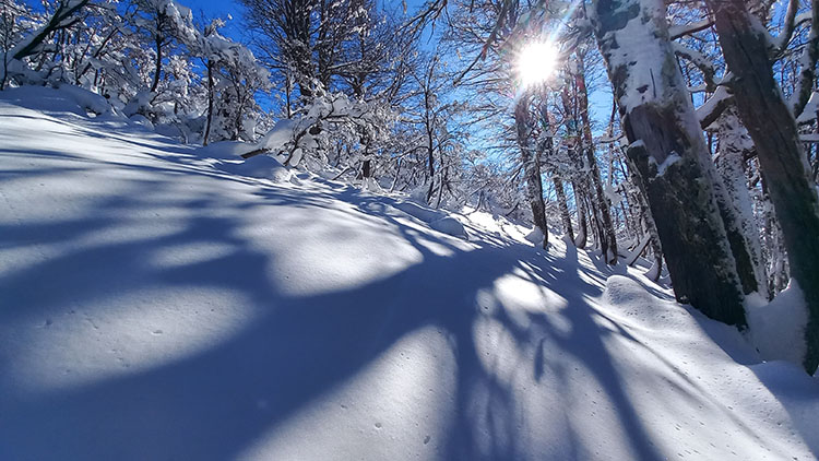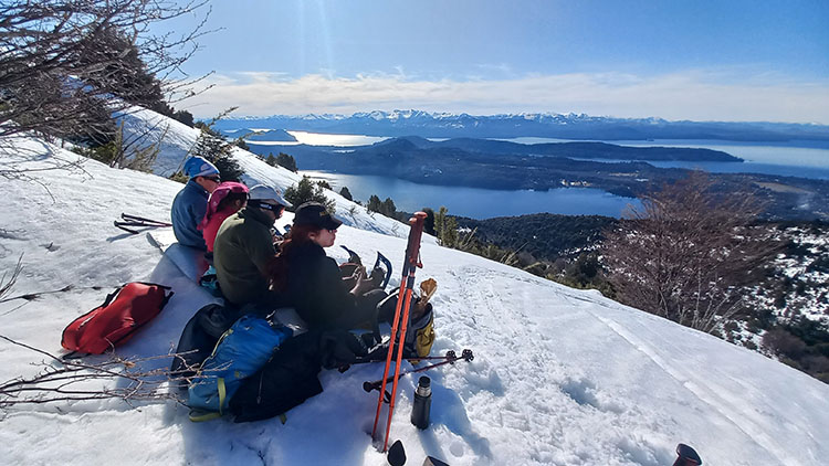 The itinerary follows the a ridge climbing through an old growth “Lenga” forest. Keep your eyes open for some Magellanic Woodpeckers and Austral Parakeets or other local birds. Quickly you gain elevation and reach the first view point. Enjoy a short break, take in the view and enjoy a hot tea while learning about the National Park landscape. The climb continuous, the ridge gets thinner and more dramatic thought the woods. After two and a half hours of hiking you reach a rocky outcrop that rises over the trees. This point offers a 360° view where you will pause for lunch and relax. It is common to watch Andean Condors flying across the mountain at this altitude; you are now at 5300 feet of elevation. The guides will melt some snow to provide you with a hot soup and a setting pad for relaxing on the snow. Time to restore your energy with two delicious home-made sandwiches and brownie. If the energy is still up, you can continue climbing towards a higher shoulder following the ridge where you can access new views and the alpine terrain. The descend follows the ascent route and in one hours you find yourself again enjoying the beautiful view with a cup of hot-cocoa on your hands!